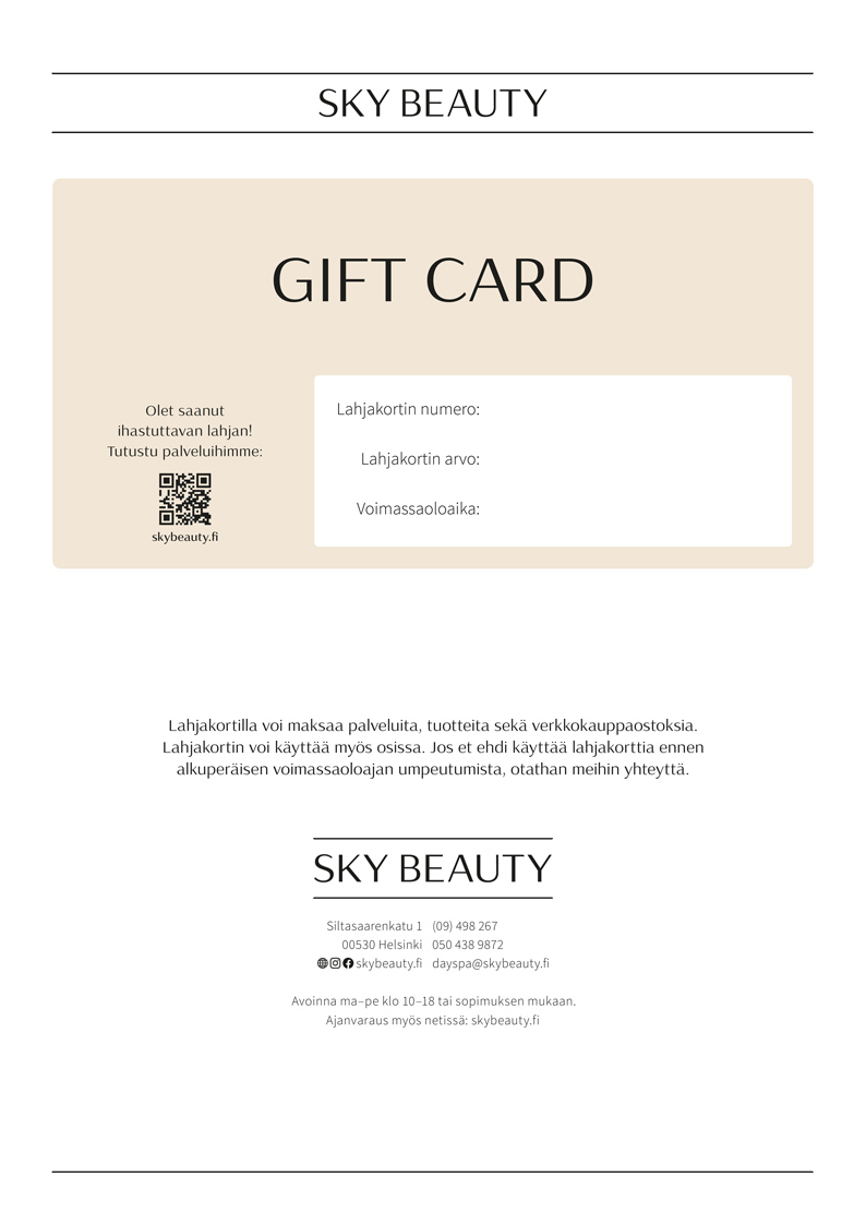 Hemmottele rakkaimpiasi SKY BEAUTY lahjakortilla!